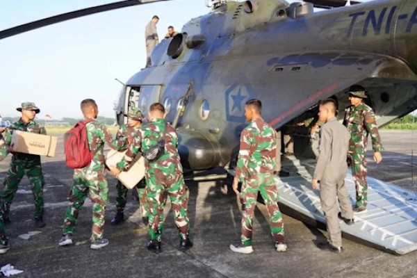 ANTARA - Kodam Iskandar Muda menyalurkan 1,5 ton bantuan logistik ke Kota Langsa, Aceh Timur, pada Selasa (2/12), menggunakan helikopter. Pengiriman lewat udara dilakukan sebagai langkah cepat untuk memenuhi kebutuhan warga di wilayah terdampak bencana. (Putri Hanifa/Rizky Bagus Dhermawan/Rijalul Vikry)