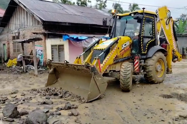 ANTARA - Sebanyak empat unit alat berat dikerahkan untuk membersihkan material tanah dan bebatuan yang menimbun badan jalan provinsi penghubung Lubuk Basung-Bukittinggi, Provinsi Sumatera Barat, usai dihantam banjir bandang susulan tiga hari lalu. Alat berat dikerahkan di Pasar Maninjau, Nagari Maninjau, Kecamatan Tanjung Raya, Kabupaten Agam, pada Minggu, (28/12), untuk membersihkan material yang menyumbat kolong jembatan di Sungai Muaro Pisang Pasar Maninjau, dan membersihkan material yang menimbun badan jalan. (Melani Friati/Andi Bagasela/Rijalul Vikry)
