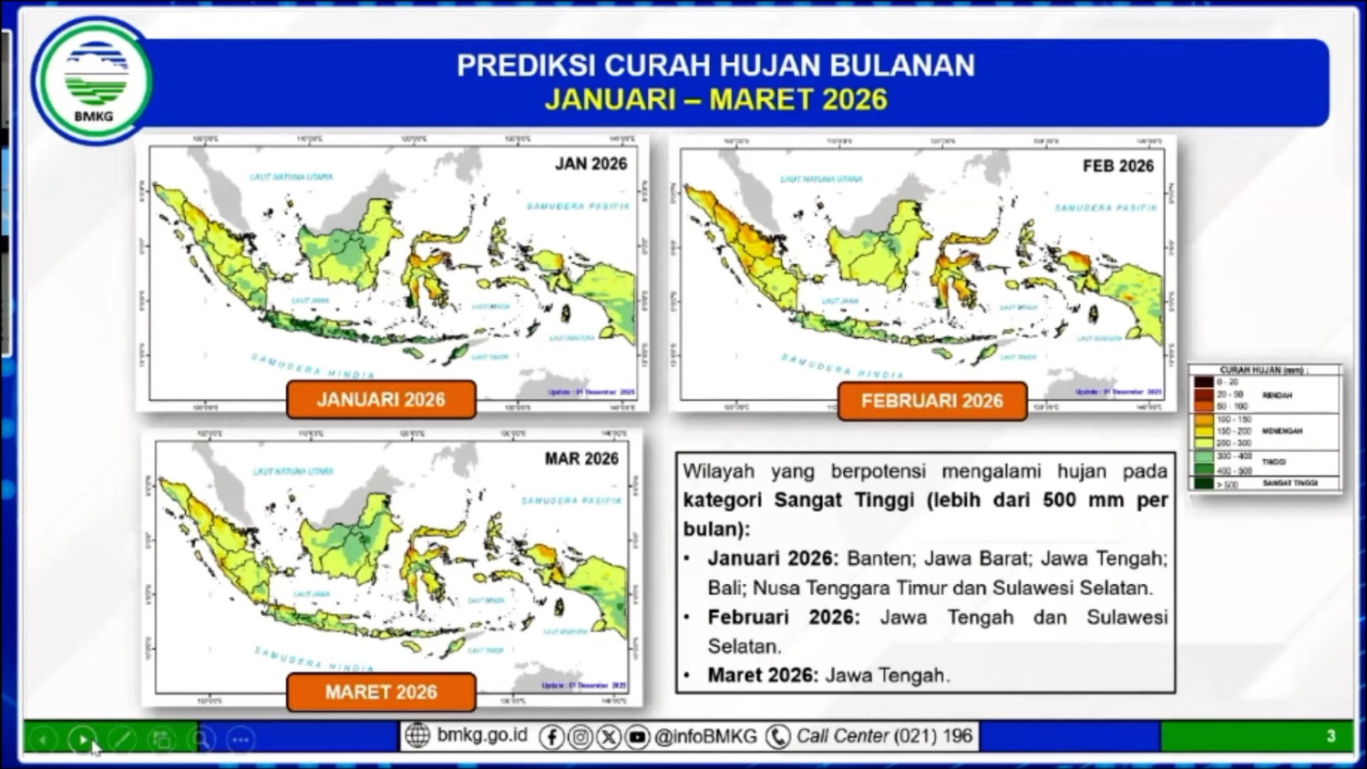 ANTARA - Badan Meteorologi, Klimatologi, dan Geofisika (BMKG), Senin (29/12), memprediksi bahwa kondisi La Nina lemah masih terus terjadi secara global hingga awal tahun 2026. Kepala BMKG Teuku Faisal Fathani menyebut, kondisi tersebut menyebabkan hujan dengan intensitas sangat tinggi terjadi di enam wilayah Indonesia pada Januari mendatang.