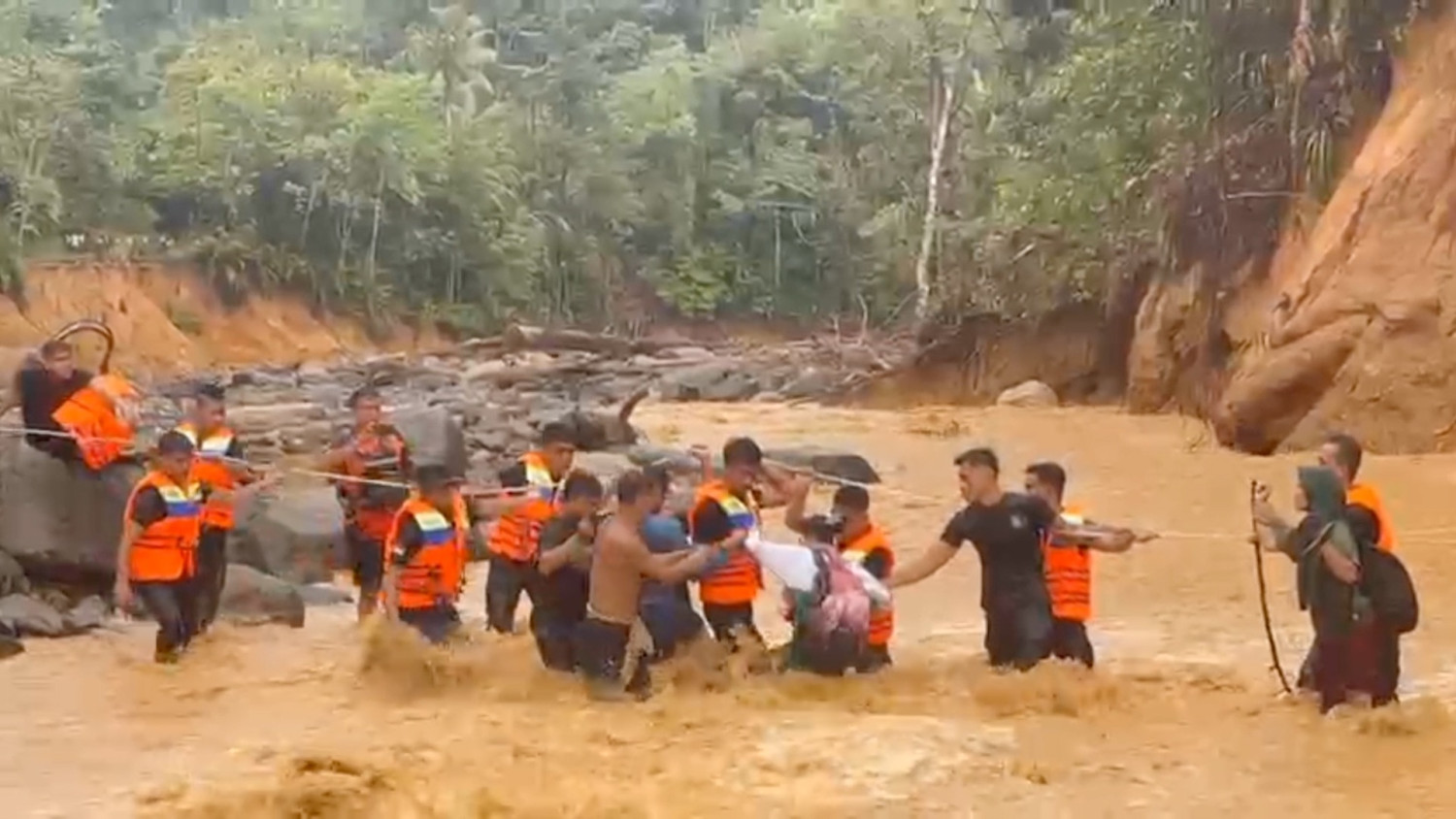 ANTARA - Evakuasi warga yang terisolasi di Lingkungan IV Hutanabolon berjalan sangat menantang. Batalyon Pelopor A Satuan Brimob Polda Sumatera Utara melaksanakan evakuasi dengan mengalahkan sejumlah rintangan yang dihadapi, demi menyelamatkan 45 warga ke daerah yang lebih aman. (M. Valery Maulidzar S/Chairul Fajri/Rinto A Navis)