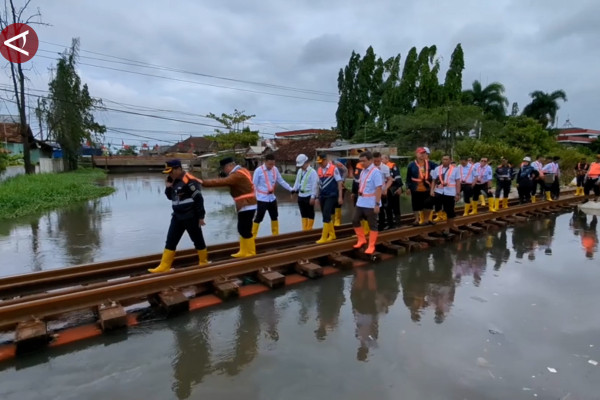 ANTARA - Menteri Perhubungan Dudy Purwagandhi meninjau langsung jalur kereta api lintas Pekalongan–Sragi yang terdampak banjir akibat cuaca ekstrem, Rabu (21/6). Peninjauan dilakukan untuk memastikan keselamatan perjalanan kereta api, serta mengevaluasi penanganan prasarana perkeretaapian pasca banjir. (Yusup Fatoni/Harviyan Perdana Putra, Yusup Fatoni/Arif Prada/Ludmila Yusufin Diah Nastiti)