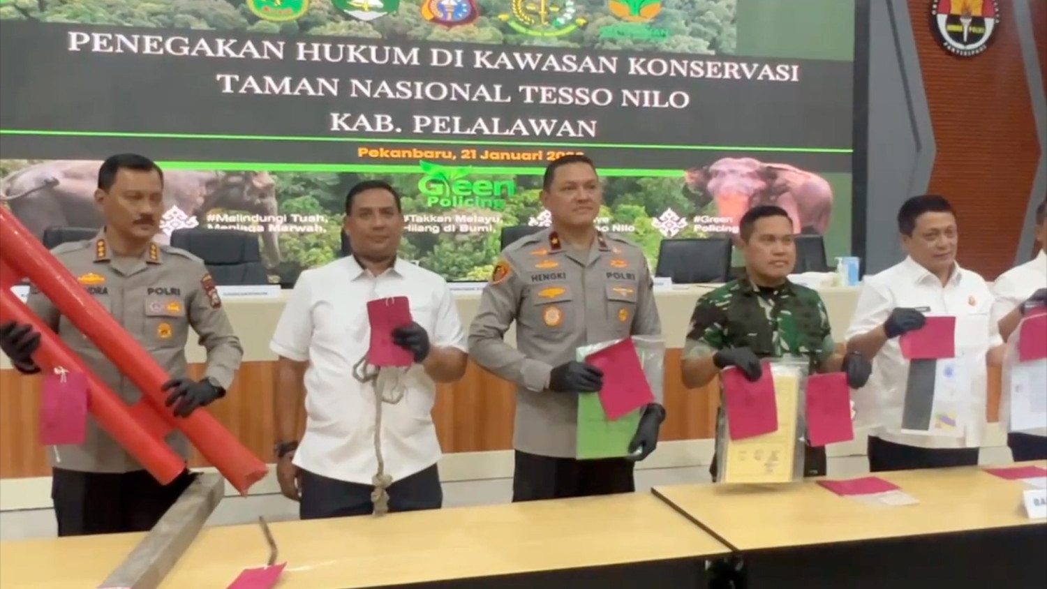 ANTARA - Polda Riau, Rabu (21/1), menetapkan sembilan orang tersangka dalam kasus perusakan fasilitas Satgas Penertiban Kawasan Hutan di kawasan Taman Nasional Tesso Nilo, Kabupaten Pelalawan. Penetapan ini merupakan bagian dari upaya penegakan hukum dalam pemulihan fungsi kawasan Tesso Nilo sebagai hutan konservasi. (Annisa Firdausi/Chairul Fajri/Farah Khadija)