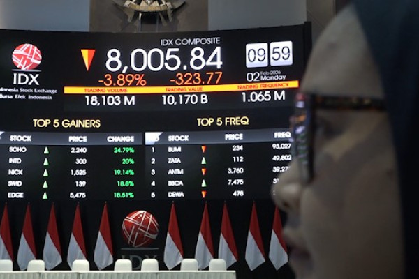 ANTARA - Indeks Harga Saham Gabungan (IHSG) Bursa Efek Indonesia (BEI) pada perdagangan sesi I hari Senin, ditutup melemah 442,44 poin atau 5,31 persen ke posisi 7.887,16. Pelemahan terkonsentrasi pada saham-saham yang terpengaruh oleh kebijakan Morgan Stanley Capital International (MSCI) dan upaya Otoritas Jasa Keuangan (OJK) dalam melakukan percepatan reformasi integritas.