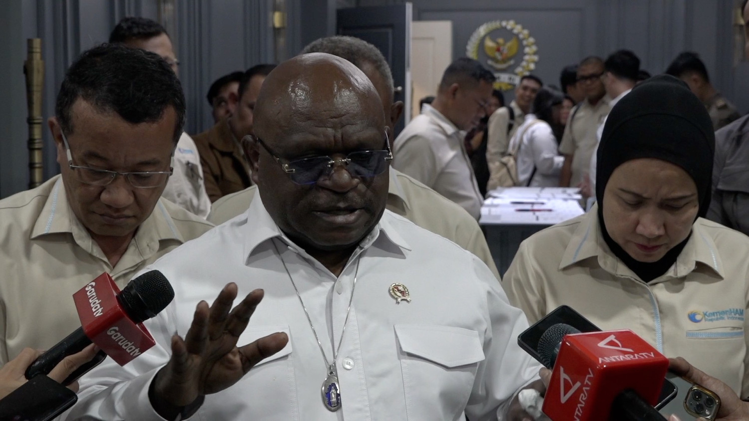 ANTARA - Menteri Hak Asasi Manusia (HAM) Natalius Pigai mengatakan akan mengatur pemberian sanksi bagi instansi pemerintah yang dinilai melakukan atau berniat melakukan pelanggaran HAM. Ditemui usai rapat kerja dengan Komisi XIII DPR RI di Jakarta, MenHAM Natalius Pigai mengatakan, aturan tersebut juga akan tercakup dalam revisi Undang-Undang Nomor 39 Tahun 1999 tentang HAM. (Sanya Dinda Susanti/Ibnu Zaki/Chairul Fajri/Roy Rosa Bachtiar)