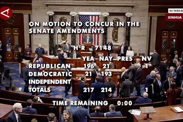 ANTARA - DPR Amerika Serikat meloloskan paket anggaran yang telah disetujui Senat untuk mengakhiri penutupan sementara sebagian pemerintahan federal yang terjadi sejak Sabtu (31/1). Paket pendanaan itu kemudian ditandatangani Presiden Donald Trump dan akan membiayai lembaga hingga 30 September, meskipun pendanaan untuk Departemen Keamanan Dalam Negeri ditunda akibat perdebatan soal kebijakan imigrasi. (XINHUA/Hilary Pasulu/Rayyan/Rinto A Navis)