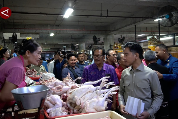 ANTARA - Wakil Presiden Gibran Rakabuming Raka mengecek harga dan ketersediaan sejumlah bahan pokok di Pasar Badung, Kota Denpasar, Jumat (13/2). Gibran mendorong Pemerintah Daerah memberikan subsidi secara merata kepada lebih banyak pedagang untuk menjaga laju inflasi dan kestabilan harga kebutuhan bahan pokok. (Rita Laura/Sandy Arizona/Rinto A Navis)