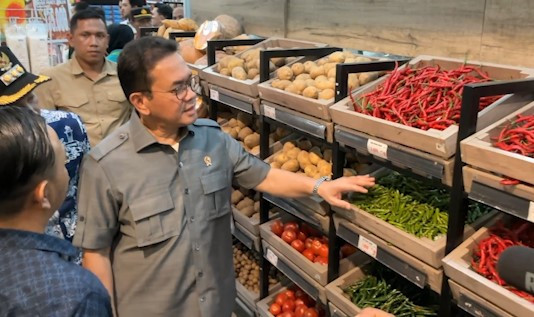 ANTARA - Menteri Perdagangan Budi Santoso memastikan pasokan dan harga bahan pokok pangan di Pasar Gambir dan toko ritel modern di Kota Tebing Tinggi, Sumatera Utara, Jumat (27/2). Menjelang Idul Fitri 1447 H, ia menyebut bahwa pasokan bahan pokok aman dan dijual dengan harga stabil. Bahkan beberapa kebutuhan pokok masyarakat dijual di bawah harga eceran tertinggi (HET) yang ditetapkan pemerintah. (M. Valery Maulidzar S/Rizky Bagus Dhermawan/Rinto A Navis)