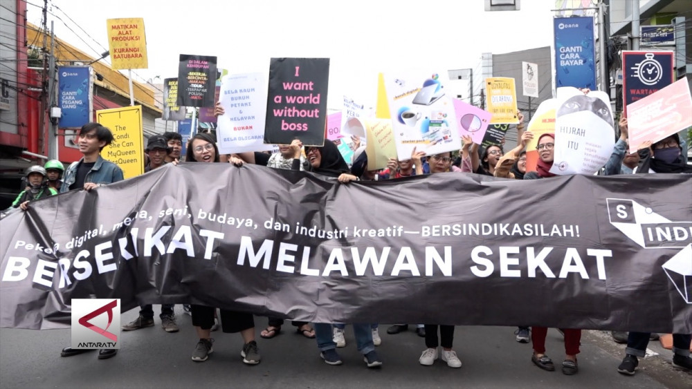 ANTARA - Perayaan hari buruh biasanya menyisakan sejumlah sampah yang tidak ramah lingkungan, namun aksi massa hari buruh, pada Rabu 1 Mei di Jakarta, yang dilakukan oleh salah satu asosiasi pekerja di bidang media dan kreatif justru mengusung tema ramah lingkungan. (Feny Aprianti/ Sandy Arizona)